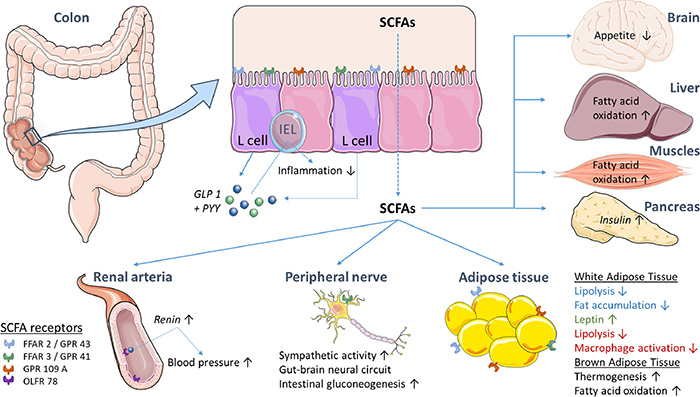 Năm 2019, một nghiên cứu được công bố ghi nhận tác động của SCFAs đến glucagon-like peptide 1 (GLP-1) có liên quan đến sản xuất hormone insulin và glucagon, giúp giảm đường máu.