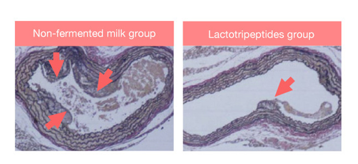 Những con chuột bị tăng cholesterol máu được cho ăn thức ăn có chứa Lactotripeptides trong thời gian 31 tuần, trong khi một nhóm chuột khác cho ăn sữa không lên men (không chứa Lactotripeptides). Kết quả nhóm chuột không cho ăn Lactotripeptides phần thành động mạch dày lên bởi các mảng bám ơ vữa hơn hẳn so với nhóm được ăn Lactotripeptides. Do đó, người ta hy vọng rằng Lactotripeptides có thể ngăn ngừa chứng xơ cứng động mạch.