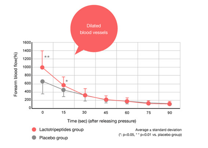 24 người bị huyết áp cao được yêu cầu tiêu thụ thực phẩm có chứa Lactotripeptides hoặc thực phẩm không chứa Lactotripeptides (giả dược) trong khoảng thời gian một tuần. So với nhóm dùng giả dược, mạch máu giãn ra và lưu lượng máu tăng lên ở nhóm ăn Lactotripeptides.
