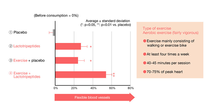 43 phụ nữ sau mãn kinh khỏe mạnh từ 50 tuổi trở lên được chia thành bốn nhóm: (1) tiêu thụ giả dược; (2) tiêu thụ Lactotripeptides; (3) tập thể dục và tiêu thụ giả dược; (4) tập thể dục và tiêu thụ Lactotripeptides, trong khoảng thời gian 8 tuần. Trước và sau nghiên cứu, họ được khám để kiểm tra sự giãn nở của các mạch máu trong cánh tay và đánh giá tính linh hoạt của mạch máu. Kết quả chỉ ra rằng ăn Lactotripeptides hoặc tập thể dục sẽ làm cho các mạch máu linh hoạt hơn. Kết hợp Lactotripeptides và tập thể dục có tác dụng hiệp đồng giúp mạch máu giãn nở tốt hơn.