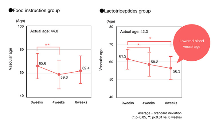 14 phụ nữ có tuổi mạch máu cao được chia thành hai nhóm. Một nhóm được yêu cầu tiêu thụ đồ uống có chứa Lactotripeptides trong khoảng thời gian 8 tuần. Nhóm còn lại được hướng dẫn chế độ ăn uống trong thời gian 8 tuần. Kết quả chỉ ra rằng tuổi mạch của các đối tượng giảm sau 4 tuần ở nhóm nhận được hướng dẫn về chế độ ăn uống. Trong nhóm Lactotripeptides, tuổi mạch của đối tượng giảm sau cả 4 và 8 tuần.