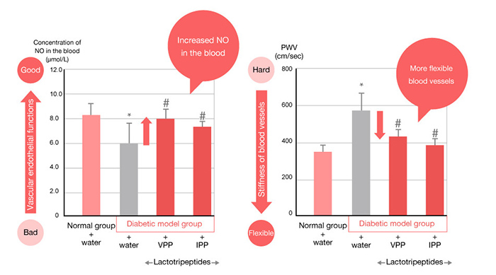 Nghiên cứu trên những con chuột mắc tiểu đường được cho uống Lactotripeptides hòa tan trong nước trong khoảng thời gian 7 tuần. So với nhóm đối chứng không bổ sung Lactotripeptides thì nhóm chuột điều trị ghi nhận đã ngăn chặn thành công sự suy giảm nồng độ NO trong máu và ức chế tăng chỉ số PWV (Vận tốc lan truyền sóng mạch).