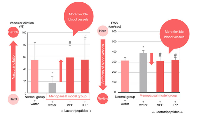Nghiên cứu trên những con chuột có triệu chứng mãn kinh bổ sung Lactotripeptides trong 24 tuần. Nhóm điều trị ghi nhận đã ức chế sự giảm giãn nở mạch máu và sự tăng chỉ số PWV (vận tốc lan truyền sóng mạch) so với nhóm đối chứng không được bổ sung Lactotripeptides.