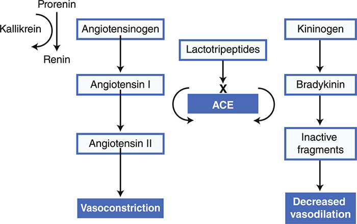 Từ lâu, nhiều peptide có hoạt tính sinh học bao gồm Peptide từ cá mòi, cá ngừ và casein, có thể làm giảm huyết áp bằng cách ức chế ACE, tương tự như cơ chế làm giảm huyết áp của nhiều loại thuốc ức chế men chuyển hiện nay. Thuốc ức chế men chuyển cũng giúp cải thiện chức năng của các tế bào nội mô của mạch máu thông qua việc ức chế sản xuất các yếu tố gây co mạch angiotensin II và tăng sản xuất bradykinin gây giãn mạch và làm giảm huyết áp.
