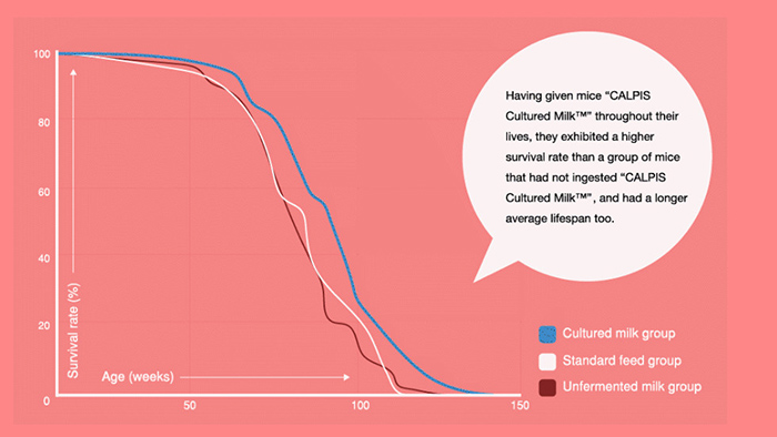Năm 1980, một thử nghiệm trên chuột cho thấy nước uống Calpis làm tăng tuổi thọ, ngăn ngừa ung thư và giảm huyết áp.