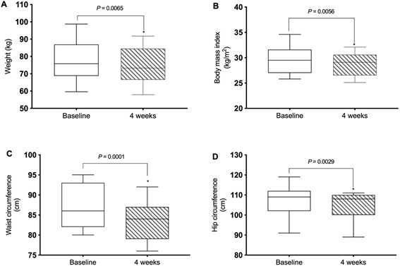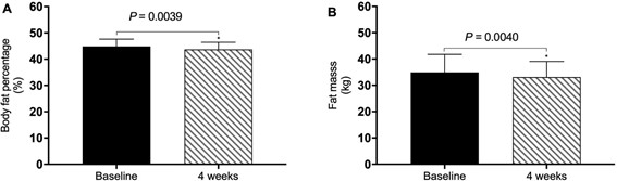Sau 4 tuần can thiệp, tỷ lệ mỡ cơ thể giảm đáng kể trung bình 1,2 ± 0,1% từ 44,9 ± 2,8% xuống 43,7 ± 2,7% (Có ý nghĩa P<0.05); khối lượng mỡ cơ thể cũng giảm đáng kể trung bình 1,7 ± 1 kg từ 34,9 ± 6,9 kg xuống 33,2 ± 5,9 kg (Có ý nghĩa P<0.05) nhưng không làm thay đổi đáng kể lượng cơ thể không mỡ so với ban đầu (không có ý nghĩa, P>0.05)