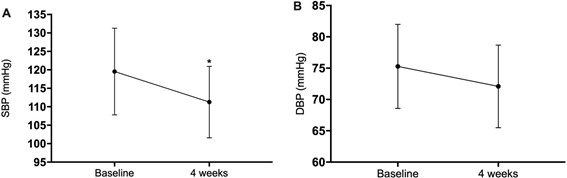 Huyết áp tâm thu giảm đáng kể trung bình 9 ± 2 mmHg từ 120 ± 11,7 mmHg xuống 111 ± 9,7 mmHg (Có ý nghĩa P<0.05). Huyết áp tâm trương giảm trung bình 3 ± 0,1 mmHg từ 75 ± 6,7 mmHg lên 72 ± 6,6 mmHg (Có ý nghĩa P<0.05) nhưng sự thay đổi không có ý nghĩa.