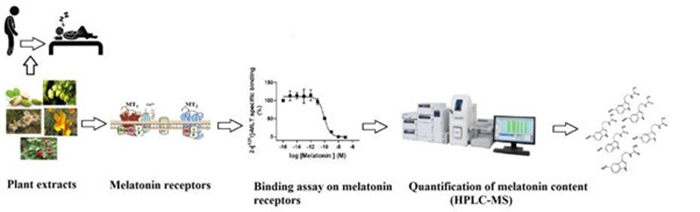 Đầu tiên, 25 chiết xuất thực vật đánh giá trong xét nghiệm liên kết cạnh tranh. 10 chiết xuất tiếp theo được chọn để đánh giá thêm trong 3 xét nghiệm chức năng ức chế sản xuất cAMP; kích hoạt ERK1/2; liên kết huy động β-arrestin2 trong các tế bào chuyển gen giả và các tế bào biểu hiện MT1 hoặc MT2. Các xét nghiệm được thực hiện để đánh giá hiệu quả tác dụng bổ sung melatonin từ bên ngoài.