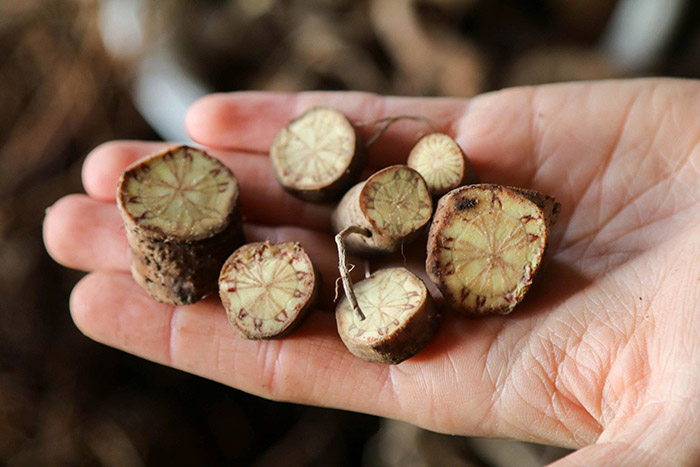 - Rễ kava sấy khô, xay thành bột mịn, pha với nước